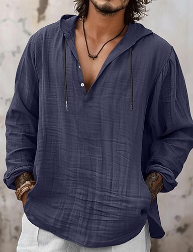 Herr Skjorta Linneskjorta Popover skjorta Sommarskjorta Standkläder Huvtröja Ensfärgat Semester Gata Svart Vit Marinblå Himmelsblå Långärmad Huva Sommar Vår Kläder