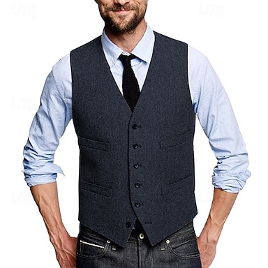 Herr Väst Gilet Bröllop Fest Dagligen Mode Affär Vår & sommar Knapp Polyester Bekväm Slät Enkelknäppt med Ett Knapphål V-hals Normal Marinblå Väst