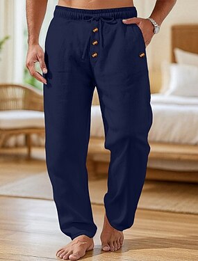 Herr Linne Byxor Långbyxor Sommarbyxor Säckiga byxor Snörning Elastisk midja Knappar Slät Komfort Andningsfunktion Fullängd Utomhus Yoga Ledigt Designer Retro / vintage Rubinrött Marinblå Oelastisk
