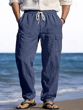Herr Linne Byxor Långbyxor Sommarbyxor Strandbyxor Casual byxor Ficka Snörning Slät Komfort Andningsfunktion Semester Dagligen Helgdag Enkel Ledigt Mörkbrun Sjöblå