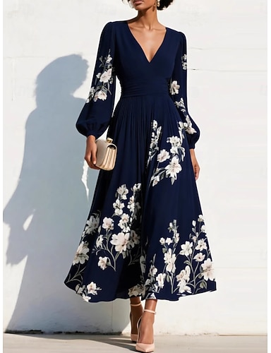 Dam Maxiklänning Chiffongklänningar Blommig klänning Klänning med tryck Elegant Mode Modern Utomhus Semester Helgdag Normal Blommig Långärmad V-hals Ljusgrön Rodnande Rosa Marinblå Grön Sommar Vår