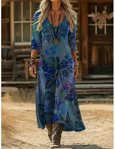 Dam Maxiklänning Boho-klänning Vintage klänning Vardagsklänning Vintage Dagligen Utomhus Semester Lös passning Blommig Långärmad V-hals Blå Ljusgrön Marinblå Mörkgrön Vår Höst