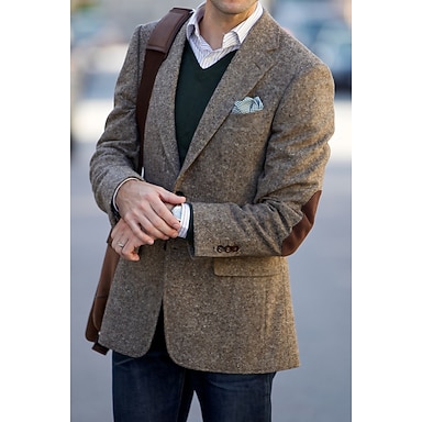 Herr Tweed -blazer Naggkrage Retro / vintage Klassisk Fiskben Blazer Brun Standardpassform Enkelknäppt tvåknappar