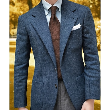 Herr Tweed -blazer Naggkrage Retro / vintage Fiskben Blazer Blå Plusstorlekar Enkelknäppt tvåknappar