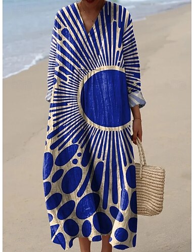 Dam Maxiklänning Solklänning A linjeklänning Semester Ledigt Boho Strand Fest Helgdag Lös passning Grafisk Geometrisk Abstrakt Långärmad V-hals Blå Mörkbrun Mörkröd Rubinrött Vår Höst