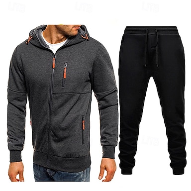 Herr Träningsoverall Outfit set Set med huvtröjor Luvtröja Utomhus Dagligen Sport Dragkedja Ficka Snörning Slät Vinrött Svart Vit Polyester Sportkläder Mode Streetwear Vår