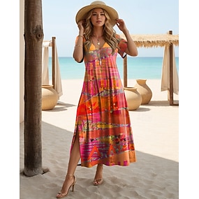 Dam Maxiklänning A linjeklänning Sommarklänning Semester Ledigt Strand Helgdag Datum Normal Grafisk Geometrisk Kortärmad V-hals Ljusgul Rubinrött Ljusbrun Orange Sommar Vår