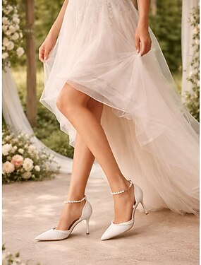 Elfenbenspärlprydda klackar med ankelrem för kvinnor, eleganta brudskor med spetsiga tår för modernt stadsbröllop
