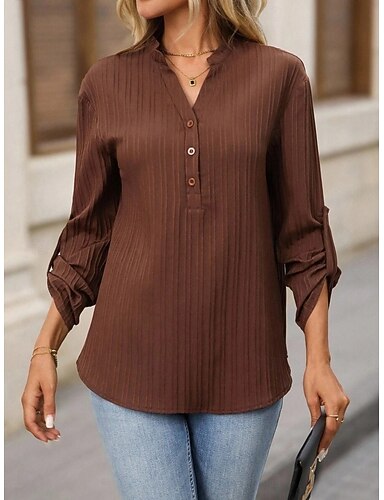 Dam Blus Knappar Ensfärgat Dagligen Grundläggande Ledigt 3/4 ärm Tröjkrage Vanliga toppar Dagligen Svart Vit Rubinrött Ljuslila Kamel Sommar Vår