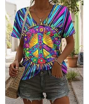 Dam T-shirt Mönster Nyans Grafisk Knytbatik Vintage Stylish Ledigt Kortärmad V-hals Vanliga toppar Dagligen Blå Sommar Vår