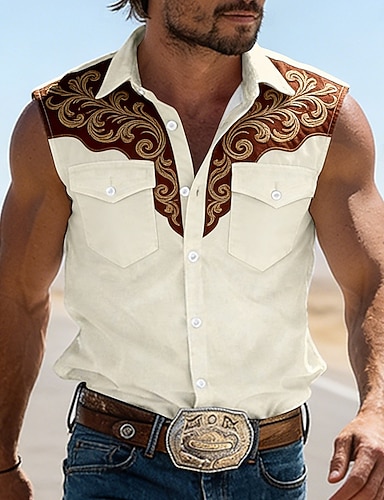 Herr Blomtryck Årgång Västerländsk skjorta Cowboyskjorta Ärmlös tröja Ärmlös vilda västern-stil Utomhus Arbete Casual Sommar Vår Nedvikt 3D-utskrift Arbetsskjortor Blå Kaki Aprikos