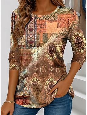 Dam T-shirt Mönster Grafisk Geometrisk Paisley Elegant bohemliv Vintage Långärmad Rund hals Vanliga toppar Dagligen Helgen Standkläder Orange Sommar Vår Höst