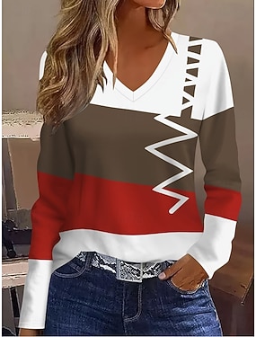 Dam T-shirt Mönster Grafisk Randig Vintage Mode Stylish Långärmad V-hals Vanliga toppar Dagligen Rubinrött Vår Höst