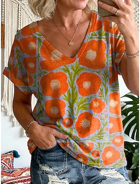 Dam T-shirt Mönster Blommig Grafisk Vintage Stylish Klassisk Kortärmad V-hals Vanliga toppar Dagligen Sport Utekväll Gul Orange Grön Sommar Vår