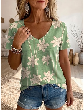 Dam T-shirt Mönster Grafisk Växter Bokstav Stylish Klassisk Ledigt Kortärmad V-hals Vanliga toppar Ledigt Dagligen Blå Grön med beige Svart Brun Kaki Sommar Vår