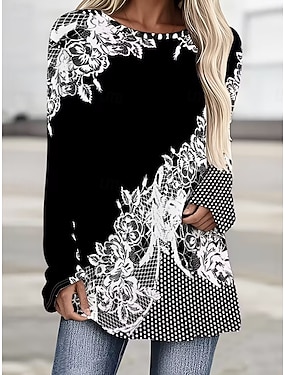 Dam T-shirt Mönster Blommig Grafisk Prickig Vintage Stylish Klassisk Långärmad Rund hals Vanliga toppar Dagligen Vit / Svart Svart Vit Vår Höst