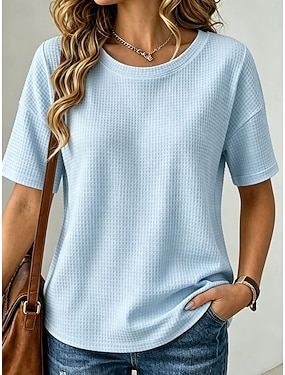 Dam våffelstickade toppar t-shirt klassisk t-shirt enfärgad modern casual kortärmad rund hals vanlig toppar daglig helgdag utekväll svart vit gul rosa vinröd sommar vår