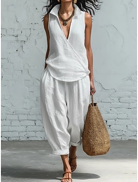 Dam Set med bomullslinne Byxuppsättningar Ärmlös Rund hals Ensfärgat Elegant Mode Streetwear Ledigt Dagligen Utomhus Blå Svart Vit Sommar Lös passning