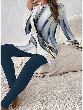 Dam T-shirt Byxuppsättningar Byxor Långärmad Rund hals Grafisk Mönster Mode Ledigt / vardag Blå Marinblå Brun Vår & Höst Normal
