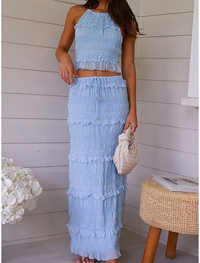 Dam Kjoluppsättningar Ärmlös Halterneck Slät Rynkad Nät Öppen rygg Elegant Mode Streetwear Ledigt Dagligen Utomhus Blå Svart Vit Sommar Normal