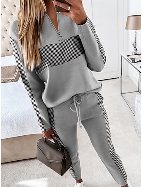 Dam Skjorta Byxuppsättningar Byxor Kortärmad Rund hals Rutig Mönster Mode Ledigt / vardag Svart Rodnande Rosa Rubinrött Vår & sommar Normal