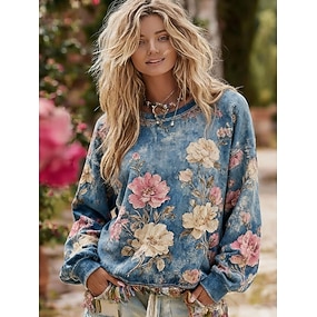 Dam Pullover-tröja Blommig Ledigt Långärmad Rund hals Vanliga toppar Ledigt Gata Vardag Blå Purpur Grå Vår Höst Vinter