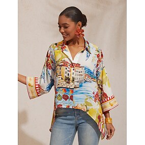 Dam Casual skjorta Abstrakt Ledigt Puffärm Svart Grafisk 3/4 ärm Elegant bohemliv Semester V-hals Sommar