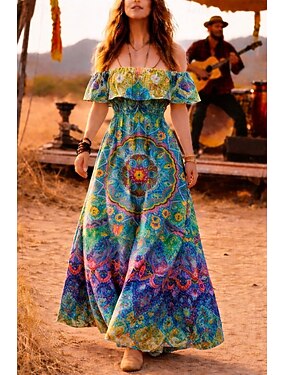musikfestival dam chiffong maxiklänning solklänning mantelklänning a-linjeklänning volangklänning semester strand utomhus strandfest normal passform blommig ärmlös bar axel vit regnbåge sommar vår