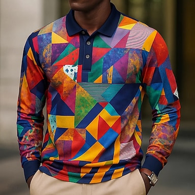 Herr Abstrakt Geometrisk Polo Långärmad Polotröjor Kavajslag Business Casual Fritids- Dagliga kläder 3D-utskrift Knappar Vår Höst Vinter Rubinrött Regnbåge