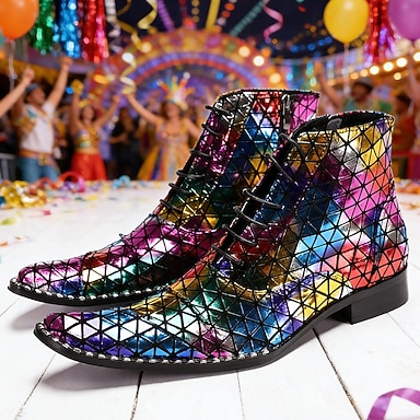 Mäns Mardi Gras flerfärgade reflektiva stövlar – Stiliga 100% premium läder glänsande geometrisk design idealiska för karneval nattliv och festliga firande