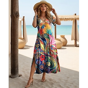 Dam Vardagsklänning Midiklänning Regnbåge Kortärmad Blommig Sommar Vår Många årstider V-hals Semester Bohemisk XS S M