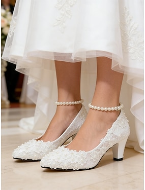 kvinnors vita spetsbröllopsklackar – eleganta blommiga brudskor med hög klack och utsmyckade blommor för brudar och formella evenemang