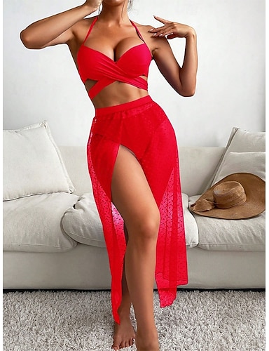 Kvinnors Bikini 2-delad baddräkt Kjol Slim Backless Semester Strandkläder Enfärgad Halterneck Ärmlös Badkläder
