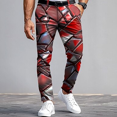 Herr Geometrisk Rutnät / Pläd Kostymbyxor Långbyxor Medium Midja Business Casual Formell Vardag Slim fit-byxor med fickor Vår Höst 3D-tryck Rubinrött Blå
