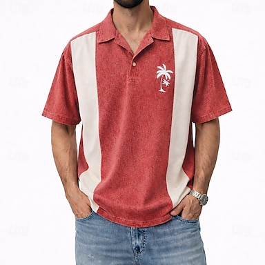 Herr Pikétröjor Tvätta skjorta i 100 % bomull Ledigt Helgdag Kavajslag Kortärmad Mode Grundläggande Palmträd Knappar Årgång Vår & sommar Blå Rubinrött Purpur Brun Grön Grå Pikétröjor