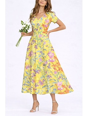 Dam Midiklänning Boho-klänning Solklänning Vardagsklänning Elegant bohemliv Semester Strand Helgdag Datum Normal Blommig Grafisk Kortärmad V-hals Gul Rubinrött Purpur Sommar Vår