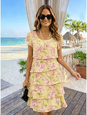 Dam Midiklänning Vardagsklänning Sommarklänning Semester Ledigt Strandstil Helgdag Normal Blommig Grafisk Kortärmad Rundhals Gul Orange Grön Beige Sommar Vår