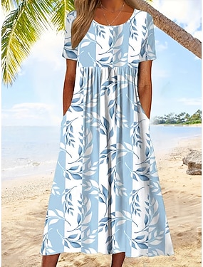 Dam Midiklänning T shirtklänning A linjeklänning Sommarklänning bohemliv Semester Vintage Normal Blommig Grafisk Kortärmad Rund hals Ljusblå Sommar Vår
