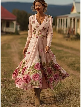 Dam Midiklänning A linjeklänning party Ledigt Boho Datum Normal Blommig Grafisk Långärmad V-hals Rodnande Rosa Sommar Vår