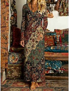 Dam Maxiklänning Boho-klänning Vintage klänning Vardagsklänning Vintage Dagligen Utomhus Semester Normal Grafisk Långärmad V-hals Grön Vår Höst