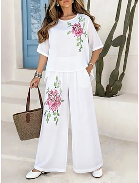 Dam Byxuppsättningar Konstbomullslinne Halvlång ärm Rund hals Blommig Elegant Mode Streetwear Ledigt Dagligen Utomhus Svart Vit Rodnande Rosa Vår & sommar Lös passning