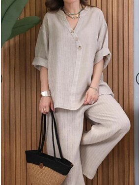 Dam Byxuppsättningar Bolero Top Konstbomullslinne 3/4 ärm V-hals Ensfärgat Aktiv Semester Dagligen Ledigt Dagligen Utomhus Vit Kaki Sommar Normal