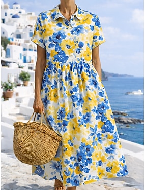 Dam Midiklänning Boho-klänning Linneblandning Skjortklänning Solklänning Elegant bohemliv Etnisk Strand Helgdag Normal Blommig Grafisk Kortärmad Tröjkrage Blå Gul Rubinrött Orange Sommar Vår