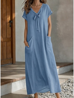 Dam Maxiklänning Konstbomullslinne A linjeklänning Sommarklänning Ledigt Dagligen Lös passning Slät Kortärmad V-hals Himmelsblå Ljuslila Grön Grå Sommar Vår