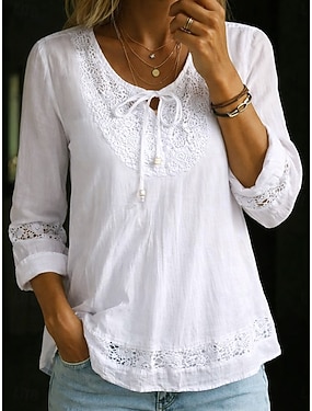 Dam Blus Konstbomullslinne Spets Lappverk Ensfärgat Stylish Ledigt 3/4 ärm Rund hals Vanliga toppar Dagligen Vit Sommar Vår Höst