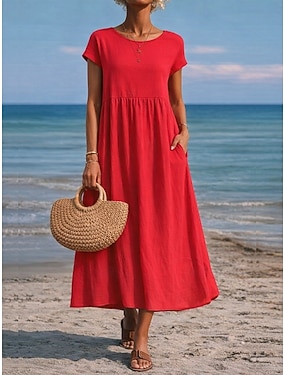 Dam Midiklänning Konstbomullslinne A linjeklänning Ledigt Dagligen Normal Slät Kortärmad Rund hals Rubinrött Sommar Vår