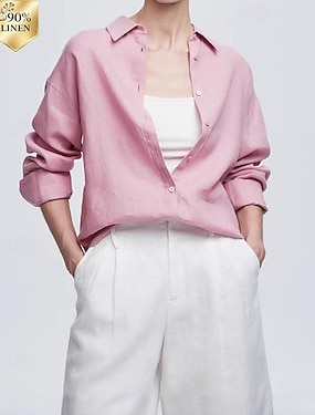 Dam Linneskjortor i bomull Blus Knappar Slät Elegant Stylish Långärmad Tröjkrage Vanliga toppar Dagligen Arbete Helgdag Blå Vit Rodnande Rosa Vår Höst