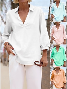 Dam Skjorta Konstbomullslinne Ensfärgat Slät Elegant Vintage Dagligen 3/4 ärm V-hals Vanliga toppar Dagligen Arbete Helgdag Hampa Vit Sommar Vår Höst