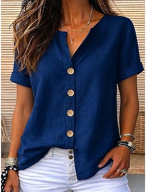 Dam Skjorta Bomulds Blanding Linneskjorta Boho skjorta Ensfärgat Slät Vintage Stylish Kortärmad V-hals Långa toppar Dagligen Utomhus Streetwear Blå Sommar Vår