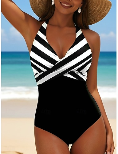 Kvinnors en-delad baddräkt sexig urtagning färgblock monokini midjekontroll hög midja slank rygglös semester strandkläder randig halterneck ärmlös baddräkt
